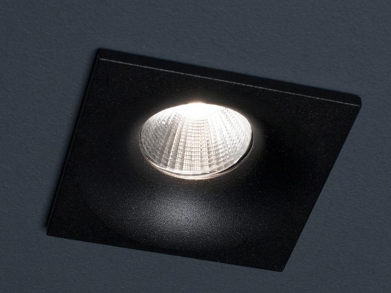 Quadratischer LED-Einbaustrahler aus gefrästem Aluminium.