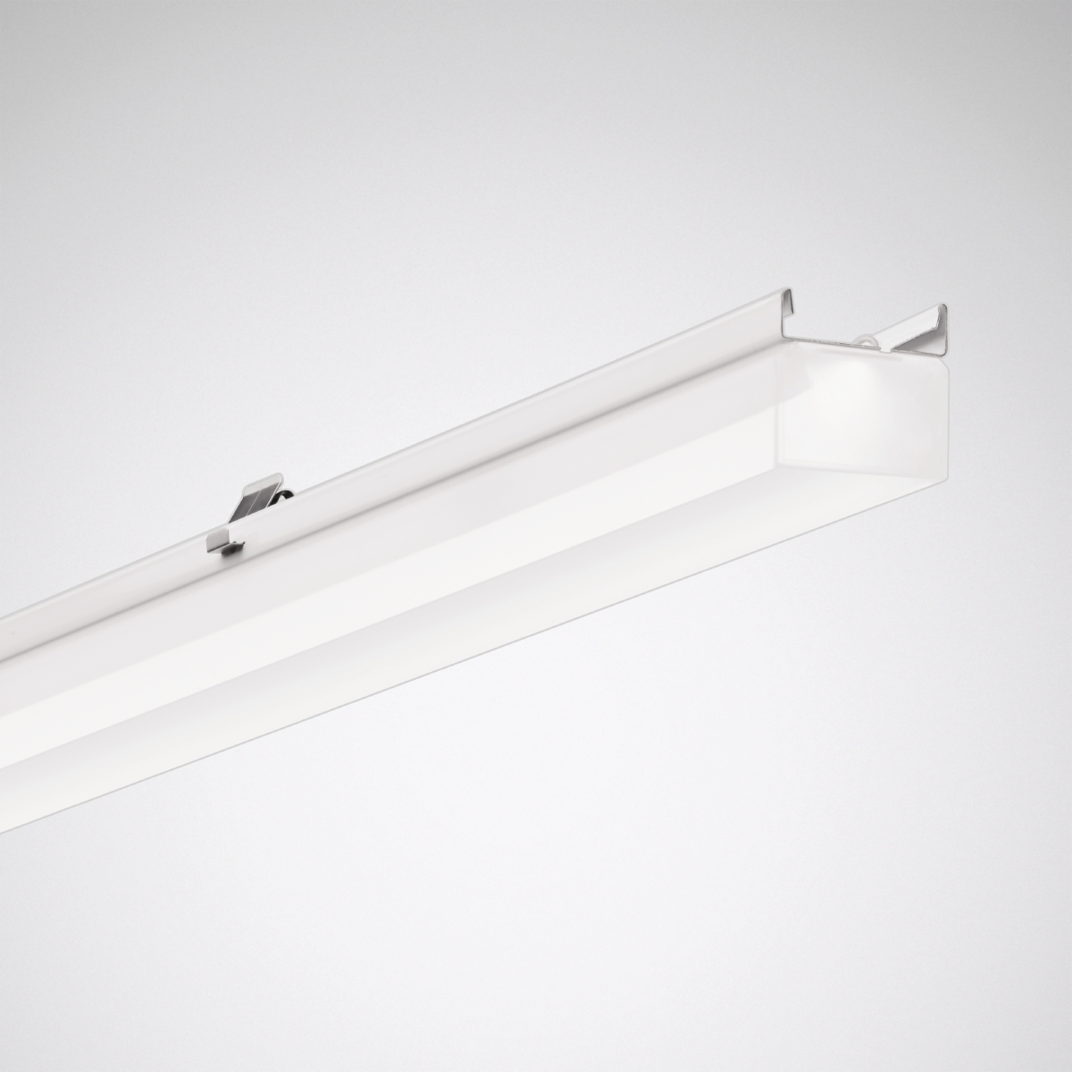 LED-Geräteträger für E-Line Lichtbandsystem. Mit opaler, transluzenter PMMA Abdeckung. Für TRILUX E-Line T5N/LED oder T8 Universal Tragprofile, T5-Anwendungen ...35-...(1475 mm), T8-Anwendungen ...58-...(1530 mm) mit Blindabdeckung L55. Blindabdeckung zum Längenausgleich bei T8-Nachrüstungsanwendungen als separat zu bestellendes Zubehör verfügbar. Optisches System bestehend aus einer transluzenten PMMA-Abdeckung mit hohem Transmissionsgrad. Mit vorwiegend direkt strahlender Lichtstärkeverteilung. Mit leichtem Indirektanteil zur dekorativen Oberflächenaufhellung (13%). Leuchtenlichtstrom 3900 lm, Anschlussleistung 27 W, Lichtausbeute der Leuchte 144 lm/W. Lichtfarbe tageslichtweiß, Farbtemperatur 6500 K, Farbwiedergabeindex Ra > 80. Lebensdauer L80(tq 35 °C) = 70.000 h, Lebensdauer L85(tq 35 °C) = 50.000 h. Geräteträger aus Stahlblech, Farbe weiß. Maße (L x B) 1475 mm x 63 mm, Leuchtenhöhe 90 mm. 75 mm maximale Breite durch Verschlusstechnik. Zulässige Umgebungstemperatur (ta): -25°C - +35 °C. Schutzklasse , Schutzart IP20, Schlagfestigkeit IK02/0,2 J, Glühdrahtfestigkeit 650 °C. Selbsttätige elektrische Verbindung durch Steckkontakte mit Phasenwahl. Die Phasenwahl erfolgt werkzeuglos. Mit elektronischem Betriebsgerät, schaltbar.