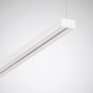 LED-Hängeleuchte für Einzel- oder Lichtbandanwendungen. Optisches System in Micro-Reflektor-Technology (MRX) mit hocheffizienten, aluminiumbedampften Reflektorkammern aus Kunststoff für hohe Entblendung und Effizienz. Dezente seitliche Lichtauskopplung über die gesamte Leuchtenlänge. Bildschirmgerecht gemäß EN 12464-1 durch begrenzte Leuchtdichten L = 1500 cd/m² für Ausstrahlungswinkel oberhalb 65° rundum. Mit direkt-indirekt strahlender Lichtstärkeverteilung. Mit innovativem, lichttechnisch wirksamen PMMA-Lichtkuppeln für die Lichtauskopplung des Indirektanteils. LED-System und Leuchtenoptik als Baugruppe werkzeuglos in Leuchtenkörper einzurasten. Baugruppe mit Stahlseil vor Absturz bei Montage gesichert. Leuchtenlichtstrom 6300 lm, Anschlussleistung 50 W, Lichtausbeute der Leuchte 126 lm/W. Lichtfarbe neutralweiß, Farbtemperatur 4000 K, Farbwiedergabeindex Ra > 80. Lebensdauer L80(tq 25 °C) = 50.000 h. Leuchtenkörper aus Stahlblech, weiß pulverlackiert. Maße (L x B): 1413 mm x 84 mm, Leuchtenhöhe 45 mm. Schutzklasse I, Schutzart IP20, Schlagfestigkeit IK02/0,2 J, Glühdrahtfestigkeit 650 °C. Netzseitiger Anschluß erfolgt mittels Steckklemmen. Elektrische Verbindung der Baugruppen erfolgt selbständig. Mit elektronischem Betriebsgerät, digital dimmbar (DALI).
