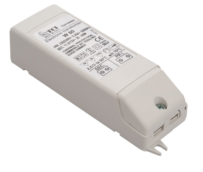 Elektronischer Transformator, 10-60W, weiß, dimmbar mit Phasenan-/ abschnittdimmer, thermisch progressive Sicherung (NTC), gesichert gegen Kurzschluß und Überlast auf Sekundärseite, automatische Wiederherstellung, elektromagnetische Verträglichkeit, Funkenstörfilter gem. EN55014/5, Transformatorbefestigung durch Ösen und Schrauben, Klemmabdeckung mit intergrierter Zugentlastung, primär 2,5mm², sekundär bis 2,5mm²