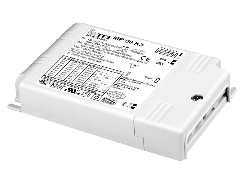 Multi-LED Konverter, weiß, 1-10V, PUSH und DALI dimmbar, Klasse II Schutz gegen elektrischen Schlag für direkte oder indirekte Kontakt, Aktive Power Factor Corrector, Analoger Eingang (NTC) für die thermische Sensoranschluss, Hilfsausgang 12 V max. 100mA, Ein- und Ausgangsklemmen auf derselben Seite (Draht Querschnitt bis zu 2,5 mm²), Spannschrauben an Primär- und Sekundärseite für Kabel mit Durchmesser min. 3mm - max.8 mm, Schutz gegen Überhitzung und Kurzschluß, Netzüberspannungen, Überlast, Deckeneinlegeausschnitt= 84mm, 230V AC, Einstellbar mittels DIP-SWITCH: (Konstantstrom) 25W - 50W / 350mA - 1050mA / 74V - 48V DC